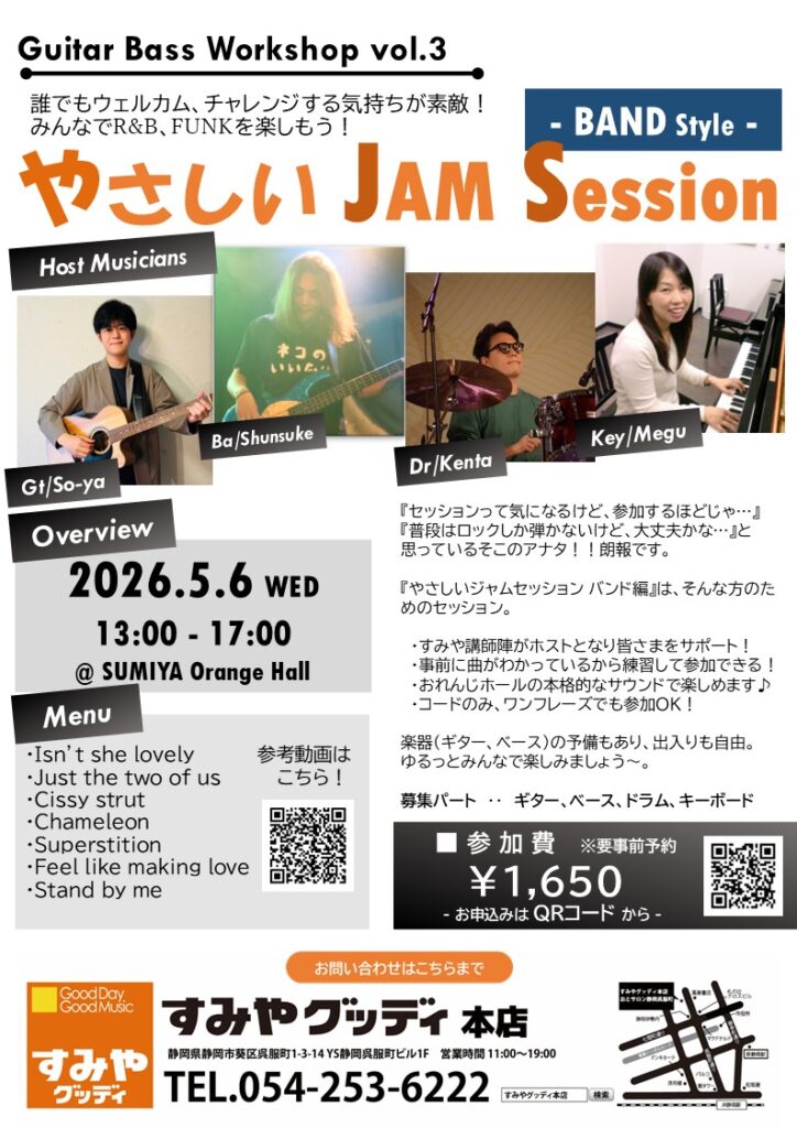 ホストミュージシャンには、すみや講師が勢揃い。皆さんの演奏をサポートするので、迷子になる心配はありません!