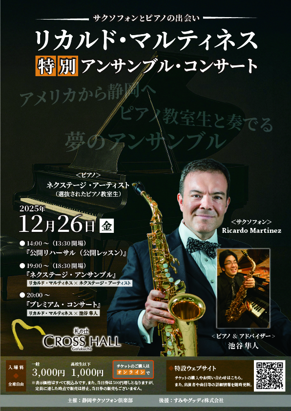 今回のコンサートを主催した池谷隼人先生のサックスレッスンをすみやで受けてみませんか?無料の体験レッスンを行っていますので、ご興味のある方はぜひお申し出ください。