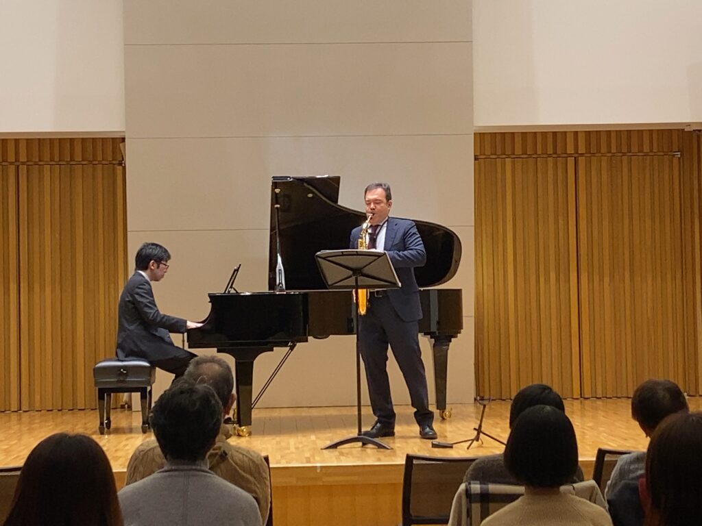 演奏前にはお二人のプレトークの時間もあり、和やかな雰囲気で始まったプレミアム・コンサート。私は池谷先生といえば、サックス!のイメージでしたが、今回はリカルドさんが吹くサックスのピアノ伴奏を担当していました。映画音楽や日本民謡など、聴きなじみのある音楽を、サックス&ピアノバージョンで聴くと新たな発見があり、新鮮で楽しかったです!私の推し曲はエスカペイズ~映画『キャッチ・ミー・イフ・ユー・キャン』より~です!好きな映画の曲なので映画のシーンを思い浮かべながら聞き入りました。お二人の息の合った演奏もさすがでした!!