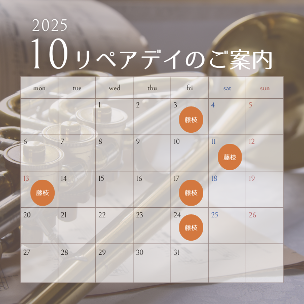10月のリペアデイは3日(金)、11日(土)、13日(月・祝)、17日(金)、24日(金)です。